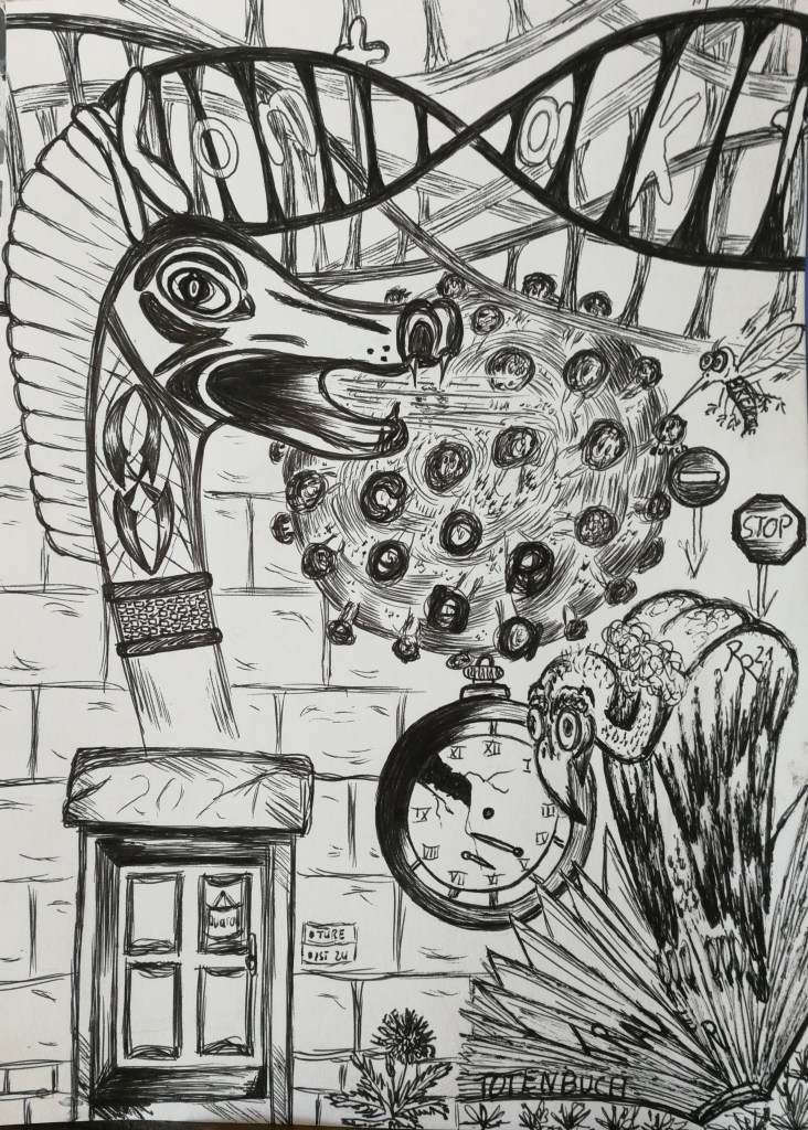 Renate Richter: „Im Bild sind vier Worte verborgen, die zusammen einen Slogan bilden. Kontakt Bremse durch Corona. Zudem sind noch ein paar Schlagwörter verborgen. Wie Z.B. im Löwenzahn, das Wort „Hoffnung“, oder im Totenbuch das Wort „Trauer“.