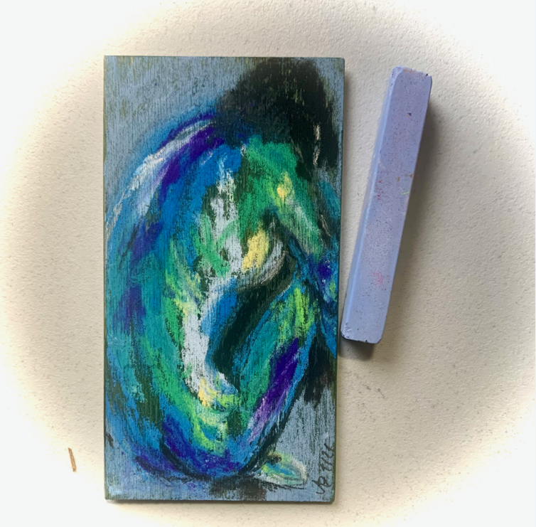 Es ist winzig klein. Grundlage: ein altes Stück Sperrholz. 3 cm x 6 cm. Darauf ein expressionistisches Bild – mit Kreide gemalt. #Trutzburg.