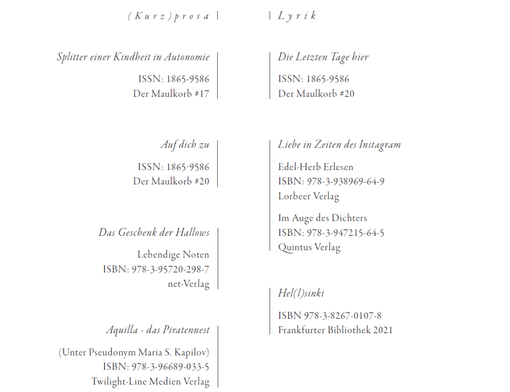 Maria Orlovskaya, geboren 1994, studierte Bioinformatik, Psychologie und Drehbuch & Dramaturgie an der Filmuniversität Babelsberg. Danach arbeitete sie in einem Arthouse Kino, als Assistenz in der Reittherapie und betrieb eine Siebdruckerei. Ein halbes Jahr war sie auf Reisen, unterwegs von einem Heavy Metal Konzert zum nächsten. Momentan lebt und arbeitet sie im größten Yogazentrum Europas, während sie jedes Jahr zahlreiche Gedichte und Kurzgeschichten veröffentlicht.