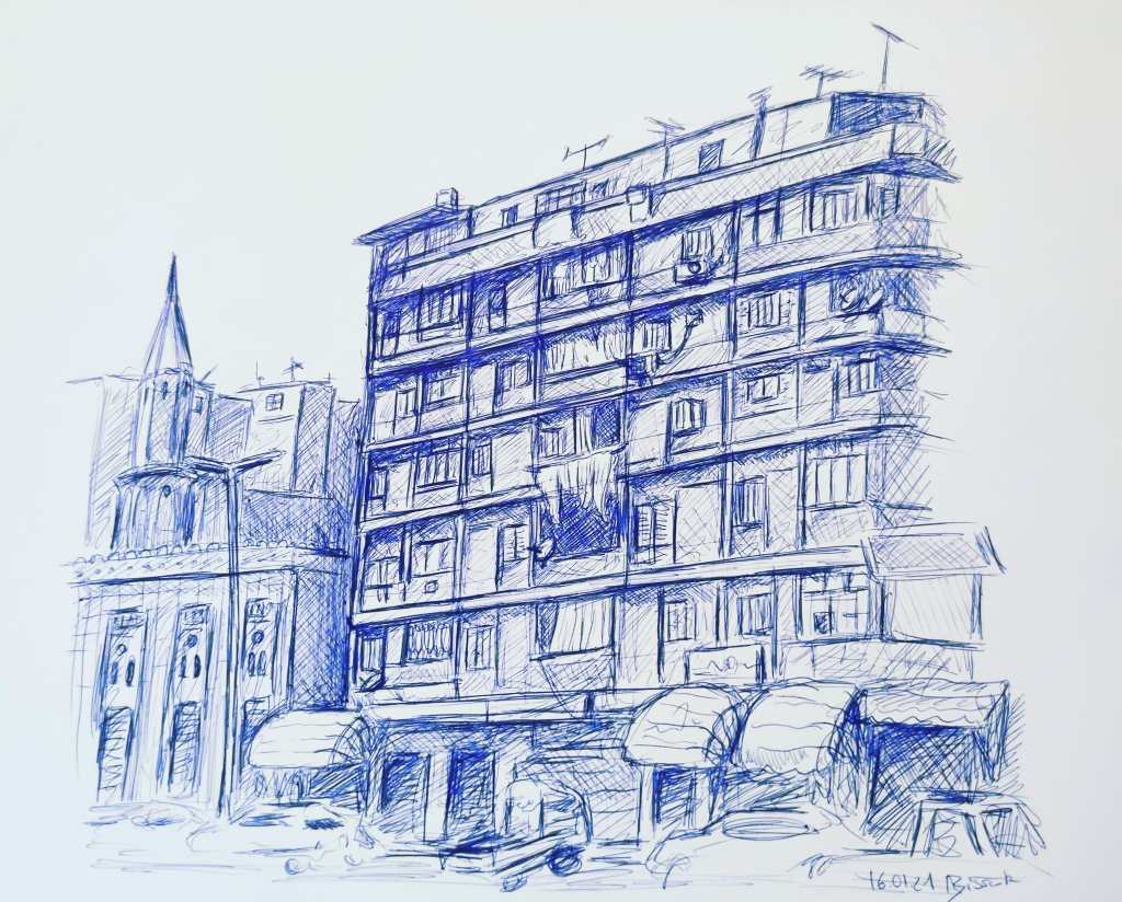 (Ägypten 1): Wohnblock in Kairo, Kugelschreiberzeichnung, A3, 2022