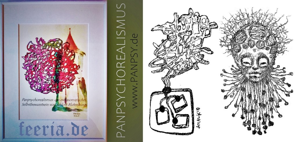 BILD 1. Der Panpsychorealismus: die extrasomatische Selbstwahrnehmung von Schloss Blutenburg (Acryl, Papier, 2021). Intrasomatisches und extrasomatisches Bewusstsein von Subsystemen (Ölpigmentstift, Papier, 2021). The consciousness of a person (for example, a guest or a resident of the Blutenburg Castle) with its subsystems is a subsystem of the consciousness of the Blutenburg Castle, which is a subsystem of the Consciousness of the Universe with the creative possibility of exchanging information between all subsystems, including subsystems remained from the past. If a person masters the technologies of green fog (smog) and the systematic approach subalgorythm SOSSS (stop – observe – smog – solution – step), then it will be able to connect to any subsystem of consciousness and self-consciousness (for example, the Blutenburg Castle) and to solve any problems. The formation of special cultural and creative skills allows a person unlimitedly to develop its extrasomatic panpsy-structure of consciousness and self-consciousness connected with the Consciousness of the Universe.