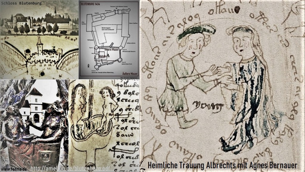 BILD 2. Das Voynich-Manuskript von Johannes Hartlieb: Schloss Blutenburg (1434), Balneotherapie (warmes Bad), die heimliche Trauung Albrechts mit Agnes Bernauer (1423), verschlüsselte Zaubersprüche (z.B. Hexensalbenrezept Unguentum pharelis: Eisenkraut, Mondraute, Einjähriges Bingelkraut, Donnerbart, Alraune, Frauenhaarfarn, Johanniskraut, Vogelblut, Tierschmalz und Zauberspruch „Sholdy doldy doldaiin dar dar dal ol ydaiin“ – es kommt nicht auf die Aussprache, sondern auf die Lautfolge an).