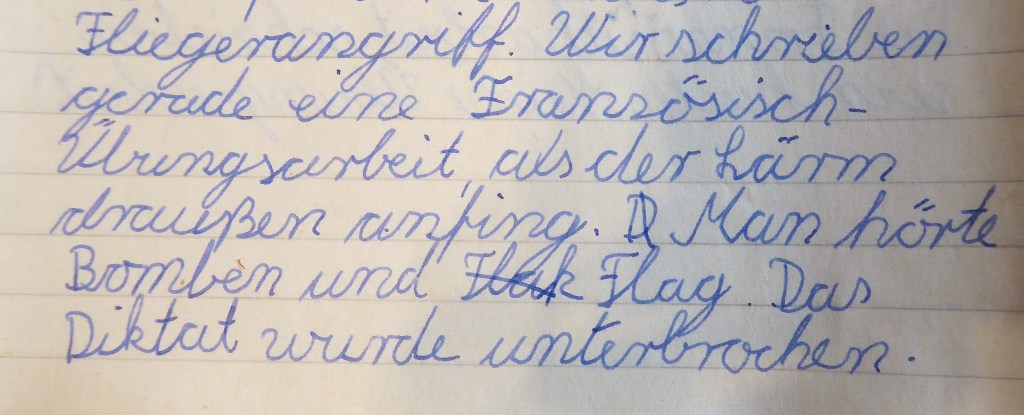 Sirenen. An- und abschwellend. Heulton. Die Köpfe der Schüler rucken hoch. Fenster auf und Vorhang zu! befiehlt der Lehrer. Das Mädchen steht auf, öffnet das Fenster. Der Alarm jetzt ohrenbetäubend. Rasch zieht sie die Vorhänge mit dem Blumenmuster zu. Die Fenster müssen offen stehen. Wegen der Druckwellen. Die sonst die Scheiben splittern lassen. Das weiß jedes Kind. Kein Füller bewegt sich. Alle warten auf die Flieger. Das Brummen am Himmel. Später die Bomben. Das Stakkato der ägyptischen Flak.