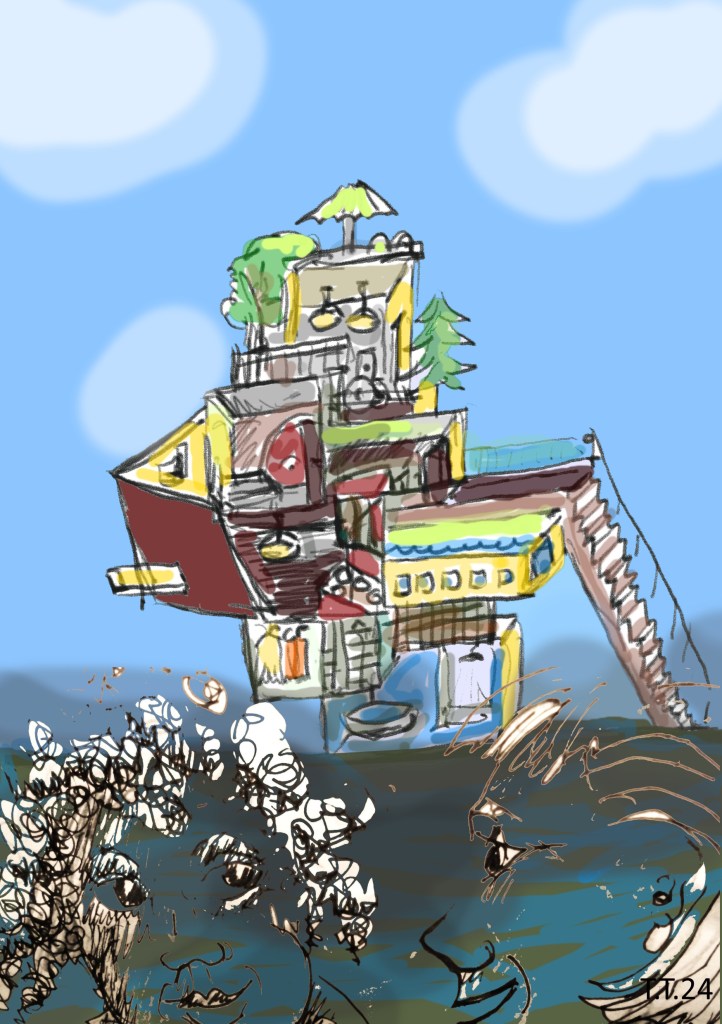 Franzi: „Wir werden alles ändern: Zum Beispiel unser Wohnzimmer nach Norden verlegen und die Küche dahin, wo jetzt das Wohnzimmer ist. Dein Zimmer kommt ins Erdgeschoss wegen deiner Arthrose, dann musst du nicht mehr Treppensteigen und das Badezimmer kommt gleich in den Keller, falls mal was ausläuft.“