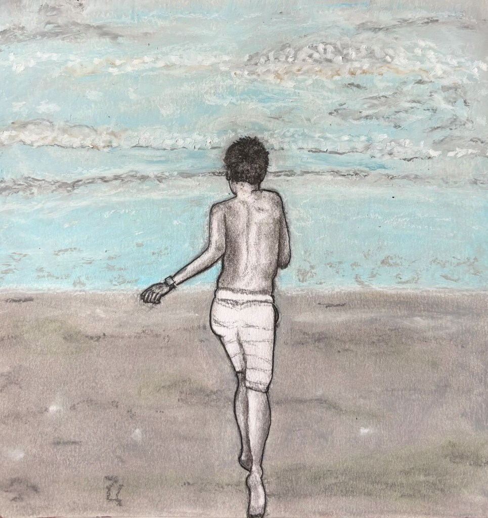 „Das eingereichte Bild zum Thema „Eltern, Kinder“ zeigt meinen Sohn, etwa sechs Jahre alt, der voller Freude in Richtung Meer läuft. Dieses Motiv fängt für mich einen Augenblick unbeschwerter Kindheit ein, doch zugleich symbolisiert es den schmerzlichen Prozess des Loslassens, den wir als Eltern durchleben. Der Moment der Leichtigkeit auf dem Bild steht in starkem Kontrast zu den Emotionen, die mich während des Malens begleiteten – die Sehnsucht nach dem kleinen Jungen und die Erkenntnis, dass er längst seinen eigenen Weg geht.