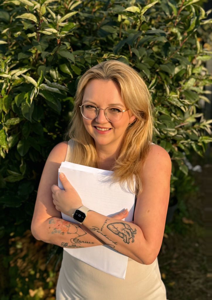 „Ich bin 29, arbeite als Praxismanagerin und nebenberuflich bin ich Autorin im New Adult Bereich. Seit ich denken kann, liebe ich Worte. Früh fing ich also an, Gedichte und Geschichten zu schreiben, was dann zu ganzen Manuskripten heranwuchs. Allerdings fehlt mir die Lyrik, die Kurzgeschichten, weshalb ich mich nun der Herausforderung „back to the roots“ stellen möchte. „