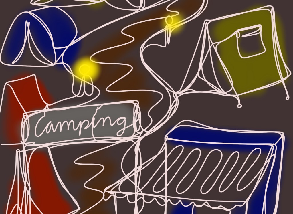 Als sie ankommen, stellen sie ihre Mopeds ab und laufen über den spärlich besuchten Platz. Die Kiefern duften. Der Himmel ist wolkenverhangen und so werden die wenigen Sterne später kaum wahrnehmbar sein. Die einzige Beleuchtung befindet sich am Haupteingang, den sie bereits hinter sich gelassen haben. Mit jedem Schritt, den sie zurücklegen, erscheint die kleine Zeltplatzwelt diffuser und verlassener, sogar ein wenig unheimlich. Sie laufen an ein paar winzigen Einmann-Zelten vorbei und an ganz wenigen großen, riesig anmutenden Wohnzelten, die zumeist verschlossen sind. Vielleicht warten sie schon auf ihren Abbau für diese Saison. Durch die Zeltwände dringt selten ein schummriges Licht wie von Taschenlampen unter einer Bettdecke.