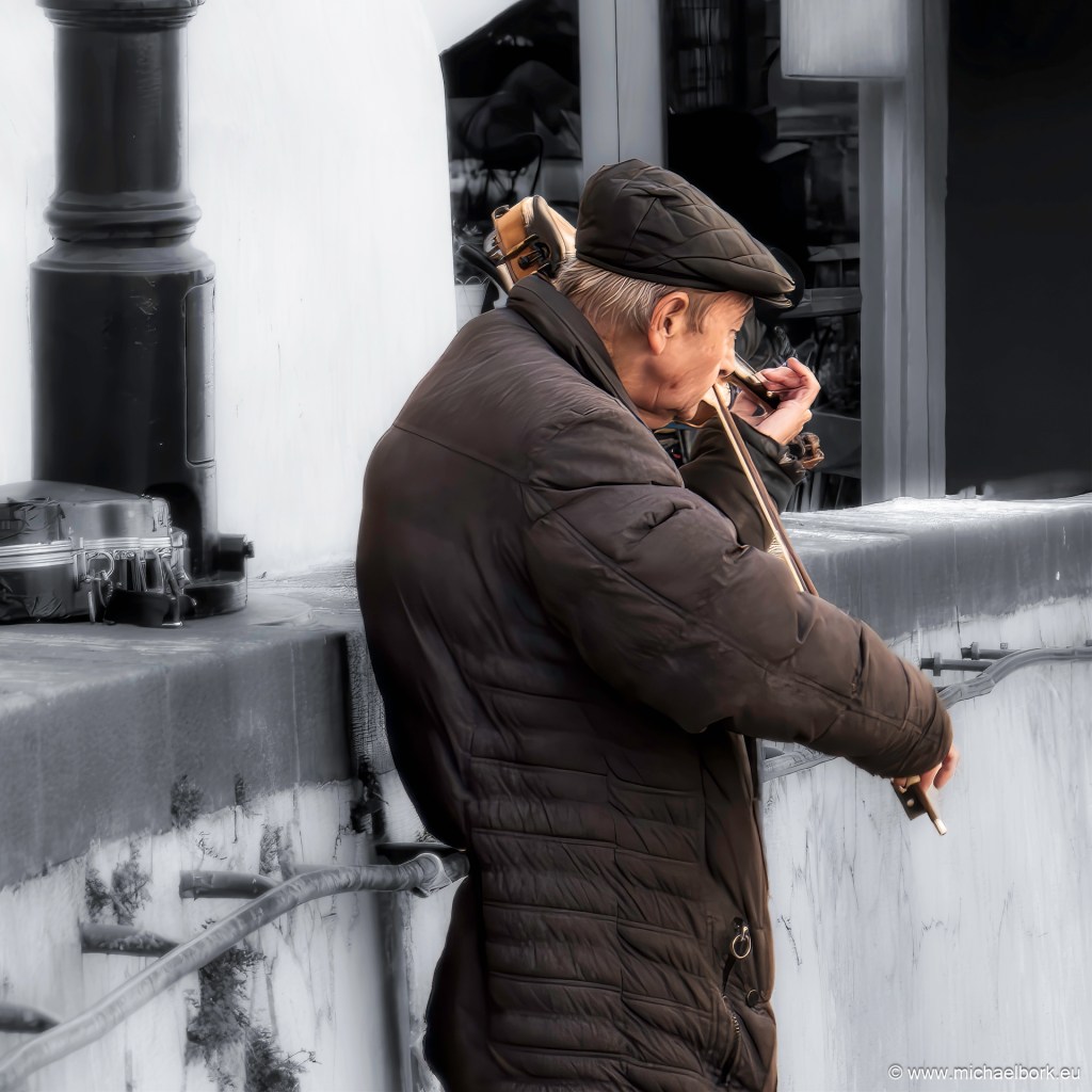 Er spielt. Und spielt. Keiner beachtet ihn. Es sind auch kaum Menschen zu dieser Jahres- und Tageszeit unterwegs. Und er spielt und spielt.