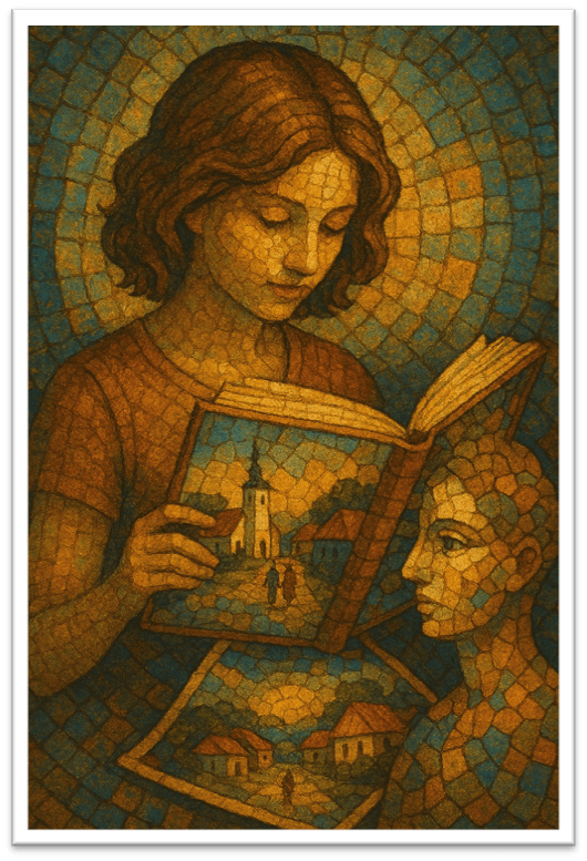 All diese Bilder – die einsamen Vorbilder aus Büchern, die vergeblichen Anstrengungen meiner Mutter, die Feste im Dorf, die Straßen voller bekannter Gesichter, die Abwanderung und das Schweigen der Gegenwart – sie sind wie kleine Steinchen in einem großen Mosaik. Manche sind hell, manche dunkel, andere wiederum glänzen nur im richtigen Licht und aus dem passenden Sehepunkt.