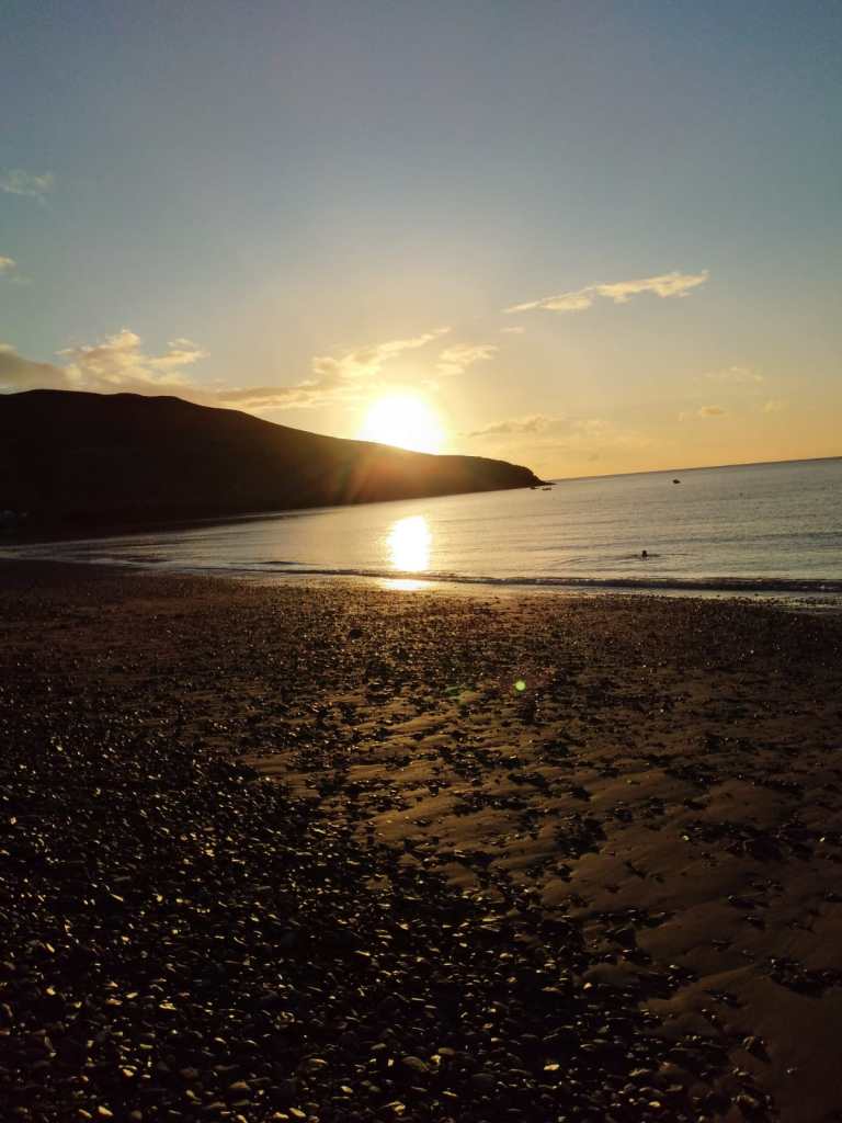 Die sandgrauen Berge glühen im Morgenrot in das Wasser hinein. Der Himmel trägt Farben, die der Schöpfung Herrlichkeit wie in einer Glaskugel widerspiegeln.