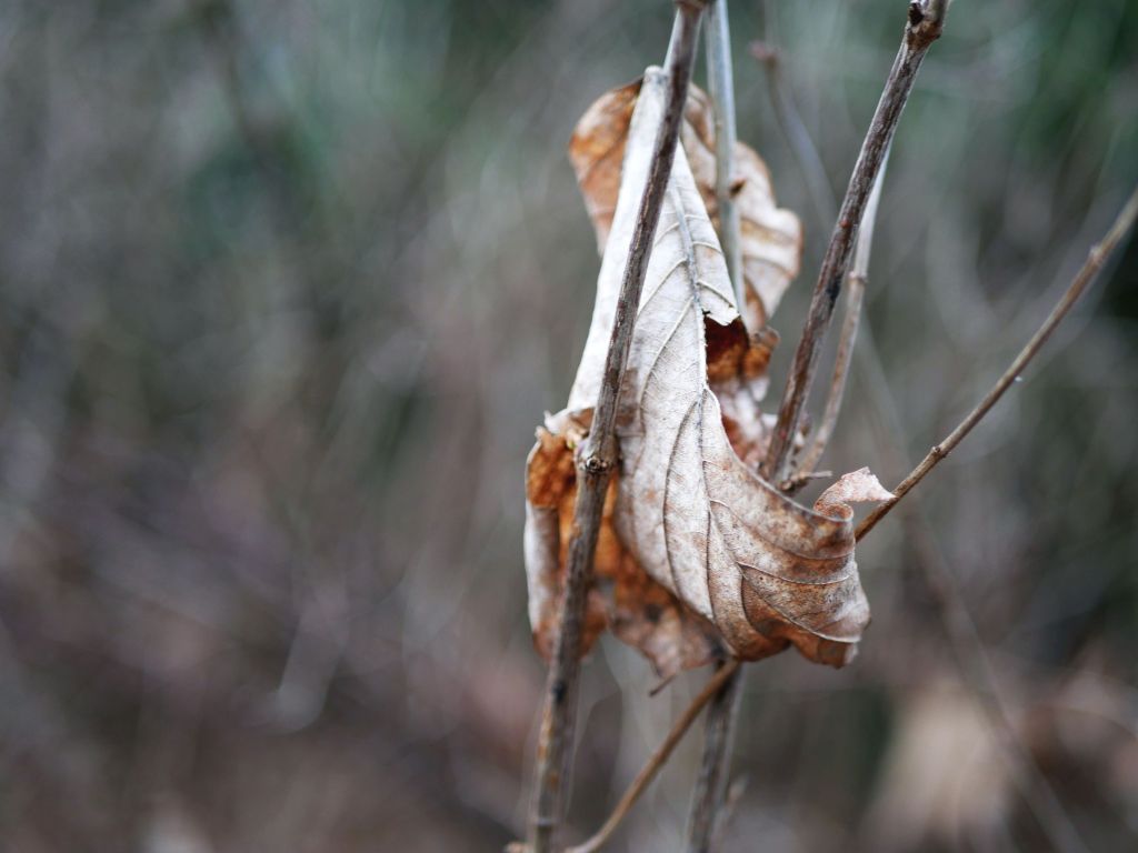 Diesmal ist es dieses unscheinbare blasse Blatt. Unentschlossen trudelt es zwischen den kahlen Zweigen, wie mein Kahn, der gerade ohne Kurs ins Ungewisse treibt. Doch das Blatt hat ein feines Stängelchen als Anker. Spinnennetzfadendünn soll es den Kahn halten. Ohne im Sturm der Elemente zu brechen. Doch vielleicht ist es stärker als angenommen.